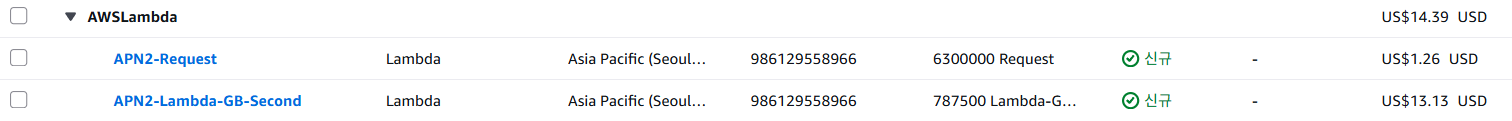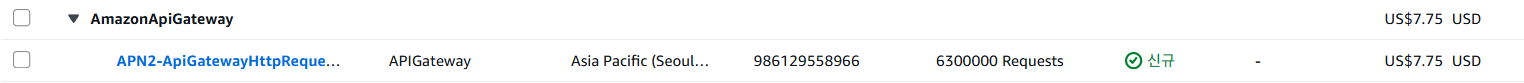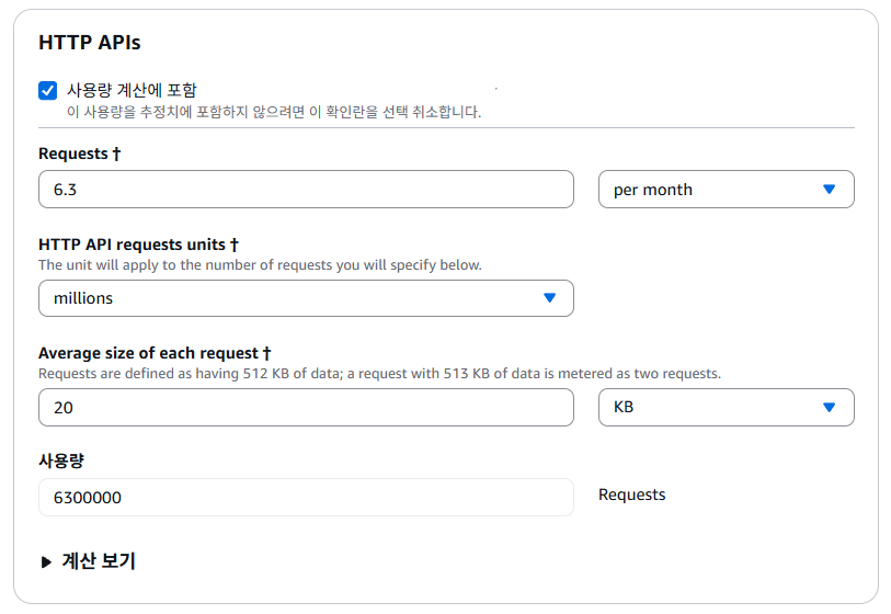 API Gateway도 사용량을 기준으로 한다. 요청 수와 요청의 크기로 계산되는데, 6,300,000건의 요청과 요청 당 약 크기는 약 20KB라고 생각하였다.