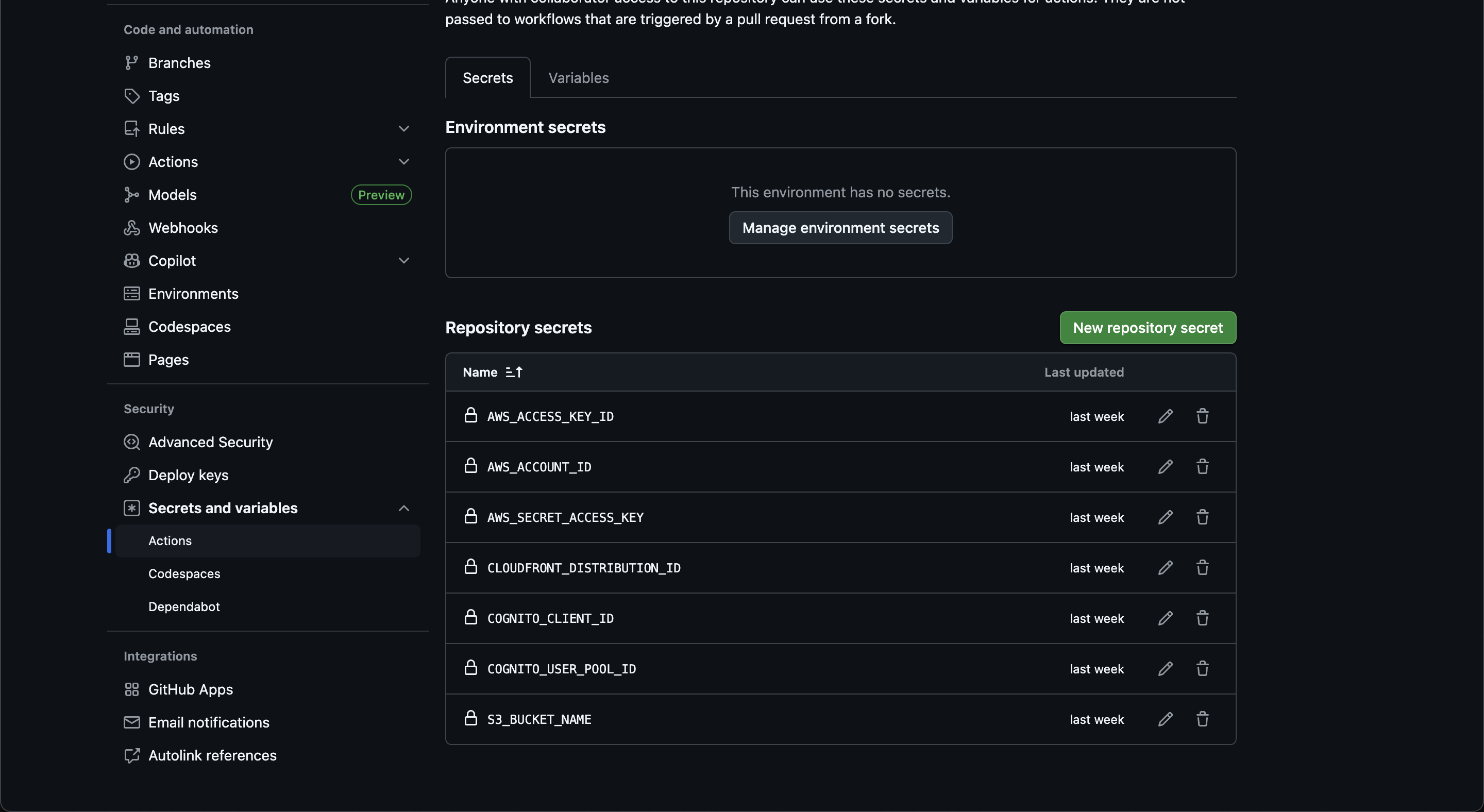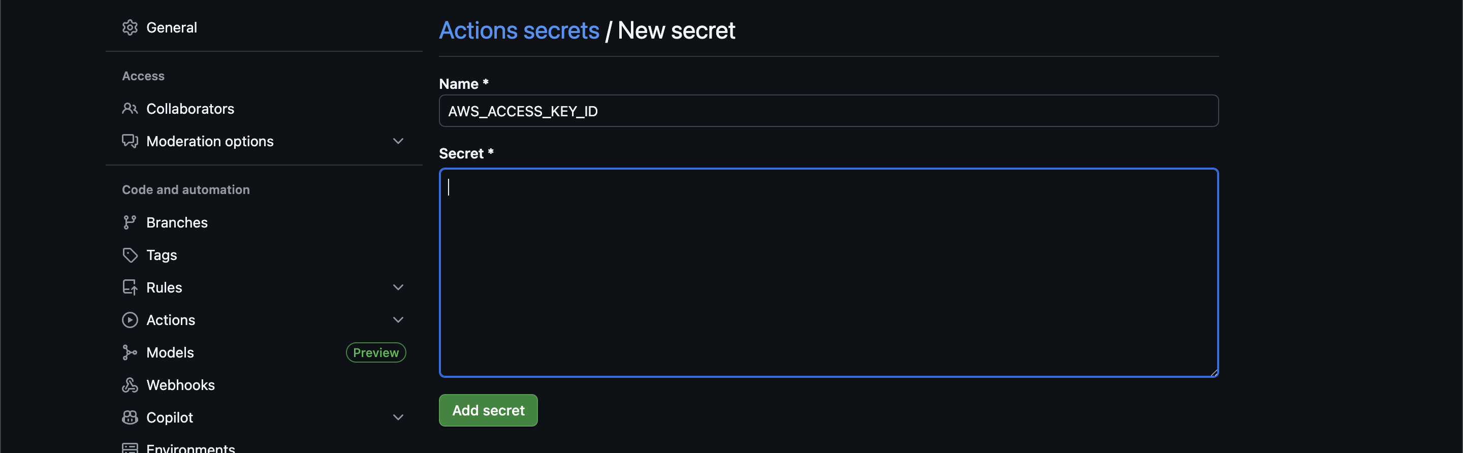 그리고 시크릿 키로 S3_BUCKET_NAME를 받는데, Github 레포지토리에서 버킷 이름을 가진 시크릿 키(S3_BUCKET_NAME)를 등록해주자.