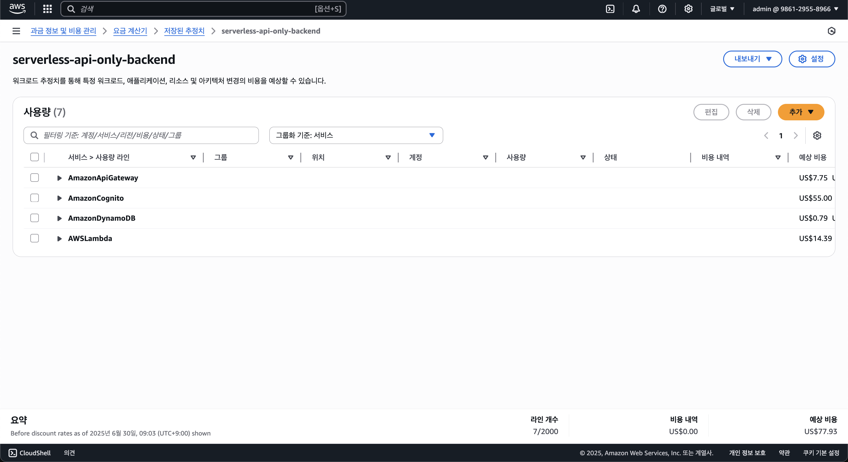 만약 API 백엔드 요금만 계산한다면 77.93달러, 약 10만 5천원 정도가 과금된다.