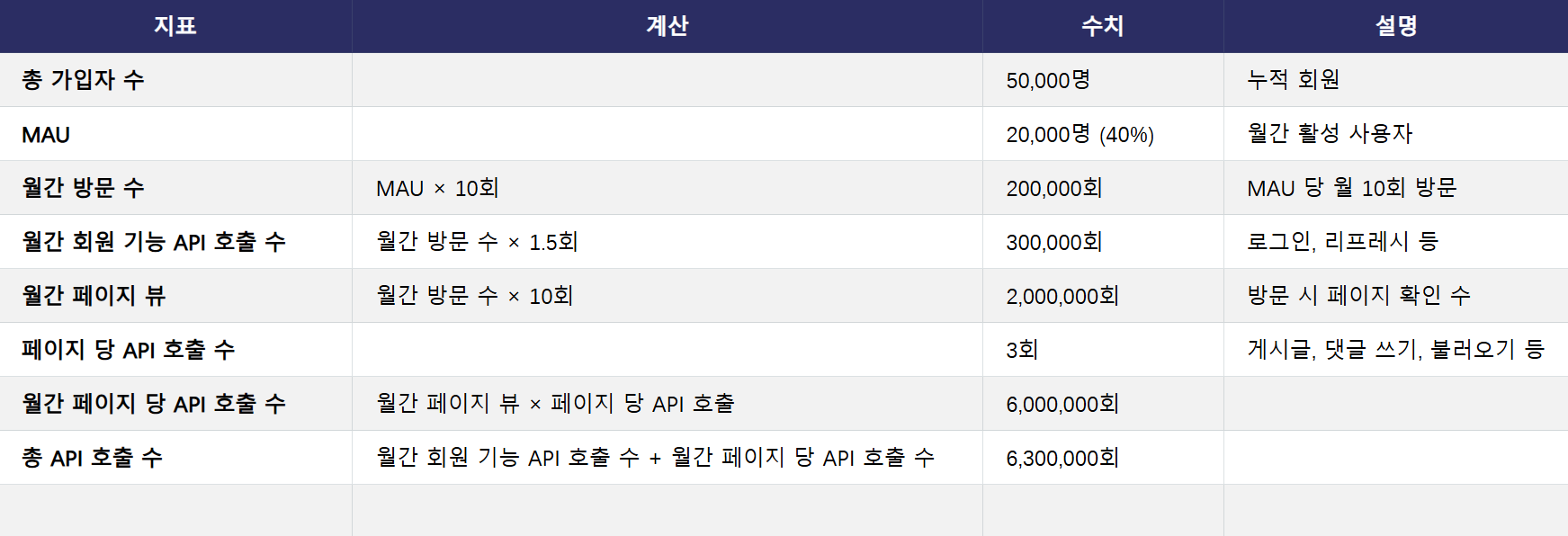 비용을 계산하기 앞서, 일단 어느정도의 트래픽이 발생하는지, MAU(월간 활성 유저 수) 등은 얼마 정도 되는지를 가정해야 편리하다.