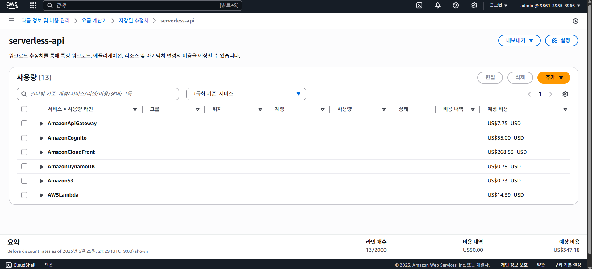물론 기능을 자세히 구현하지 않고 Cognito와 간단한 CRUD API 구현만 해뒀기 때문에 이정도로 저렴하지만, 실제 서비스에서도 요청된 수 + 실행 시간 만큼 과금되기 때문에 스타트업이나 확장성 등이 중요한 서비스에선 서버리스가 유리하게 작용된다는 것이 핵심이다.