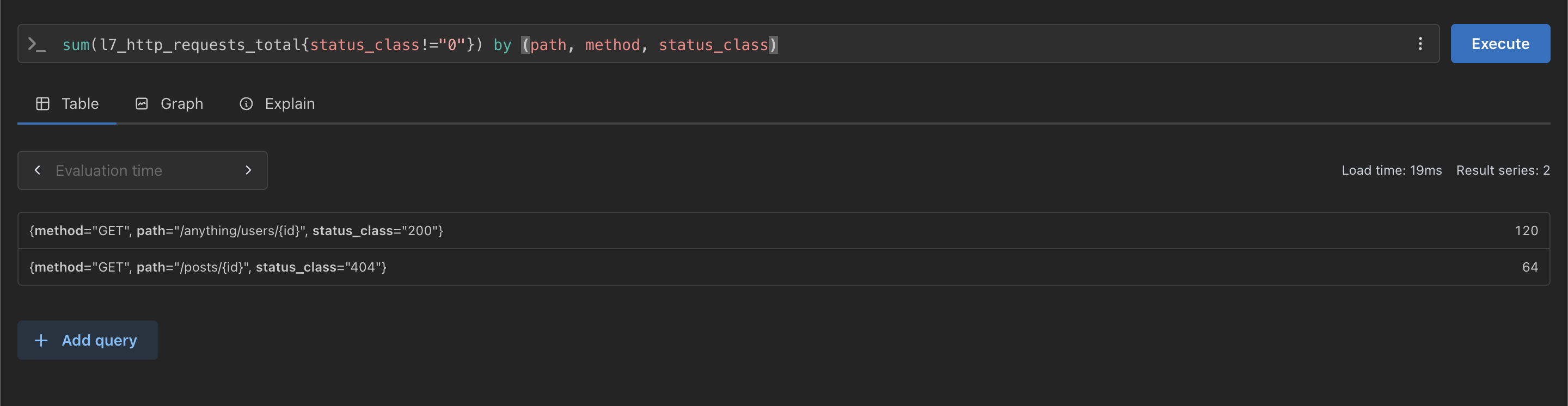 sum(l7_http_requests_total{status_class!="0"}) by (path, method, status_class)