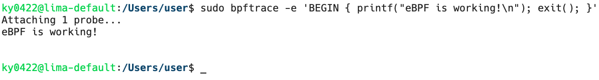 앞서 설명하였듯 필자는 MacOS를 사용하기 때문에 Lima를 통해 eBPF를 지원하는 Linux Kernel 및 Ubuntu 가상 머신을 실행하였다.