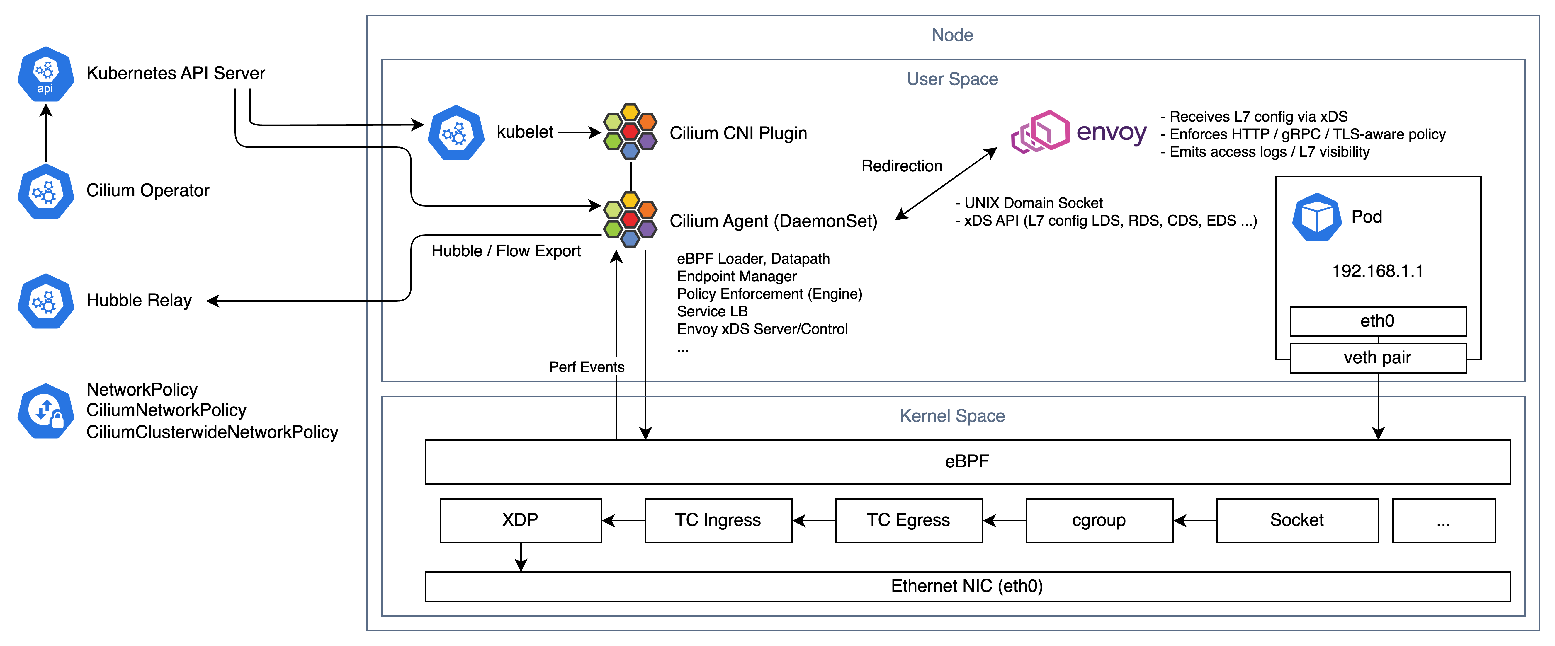 이러한 eBPF 기술을 사용하는 가장 유명한 Kubernetes CNI 플러그인이 바로 Cilium CNI이지 않을까 싶다. Calico나 Flannel CNI의 경우 앞선 iptables/IPVS를 기반으로 하는 반면 Cilium은 Kernel Space의 eBPF 프로그램을 로드하여 네트워킹 및 Advanced NetworkPolicy를 지원한다. (필요시 NetworkPolicy Only로 Cilium을 구성할 수 있다.)