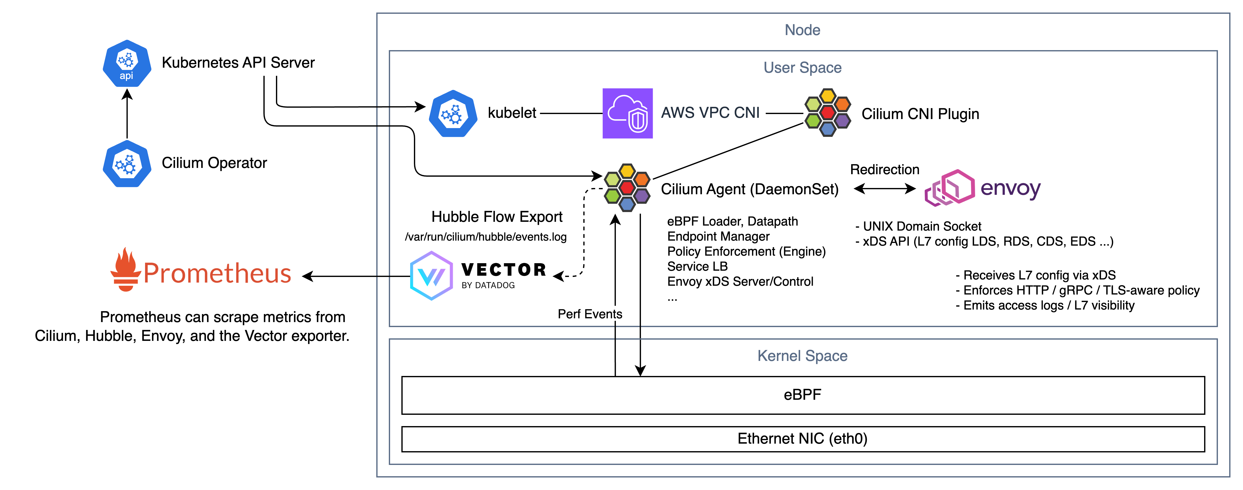 {"flow":{"time":"2026-03-26T02:35:29.114383229Z","uuid":"56dced30-2f83-4c15-9370-cd7ab1e1e048","emitter":{"name":"Hubble","version":"1.19.2+g3977f6a1"},"verdict":"FORWARDED","ethernet":{"source":"1a:82:0b:a0:bd:95","destination":"c6:4e:da:5e:31:bb"},"IP":{"source":"192.168.85.176","destination":"192.168.95.3","ipVersion":"IPv4"},"l4":{"TCP":{"source_port":41012,"destination_port":8181,"flags":{"ACK":true}}},"source":{"identity":1,"labels":["reserved:host"]},"destination":{"ID":2570,"identity":54686,"cluster_name":"default","namespace":"kube-system","labels":["k8s:eks.amazonaws.com/component=coredns","k8s:io.cilium.k8s.namespace.labels.kubernetes.io/metadata.name=kube-system","k8s:io.cilium.k8s.policy.cluster=default","k8s:io.cilium.k8s.policy.serviceaccount=coredns","k8s:io.kubernetes.pod.namespace=kube-system","k8s:k8s-app=kube-dns"],"pod_name":"coredns-69b5896d49-9zh67","workloads":[{"name":"coredns","kind":"Deployment"}]},"Type":"L3_L4","node_name":"ip-192-168-85-176.ap-northeast-2.compute.internal","node_labels":["alpha.eksctl.io/cluster-name=cilium-poc","alpha.eksctl.io/nodegroup-name=ng-poc","beta.kubernetes.io/arch=amd64","beta.kubernetes.io/instance-type=t3.medium","beta.kubernetes.io/os=linux","eks.amazonaws.com/capacityType=ON_DEMAND","eks.amazonaws.com/nodegroup-image=ami-013c8233b9e7c0812","eks.amazonaws.com/nodegroup=ng-poc","eks.amazonaws.com/sourceLaunchTemplateId=lt-0bc224f77a464550b","eks.amazonaws.com/sourceLaunchTemplateVersion=1","failure-domain.beta.kubernetes.io/region=ap-northeast-2","failure-domain.beta.kubernetes.io/zone=ap-northeast-2c","k8s.io/cloud-provider-aws=529fc8a9de23b77095f82c3f10b3de38","kubernetes.io/arch=amd64","kubernetes.io/hostname=ip-192-168-85-176.ap-northeast-2.compute.internal","kubernetes.io/os=linux","node.kubernetes.io/instance-type=t3.medium","topology.k8s.aws/zone-id=apne2-az3","topology.kubernetes.io/region=ap-northeast-2","topology.kubernetes.io/zone=ap-northeast-2c"],"event_type":{"type":4},"traffic_direction":"EGRESS","trace_observation_point":"TO_ENDPOINT","trace_reason":"ESTABLISHED","is_reply":false,"interface":{"index":15,"name":"eni3e06f27d75b"},"Summary":"TCP Flags: ACK"},"node_name":"ip-192-168-85-176.ap-northeast-2.compute.internal","time":"2026-03-26T02:35:29.114383229Z"}