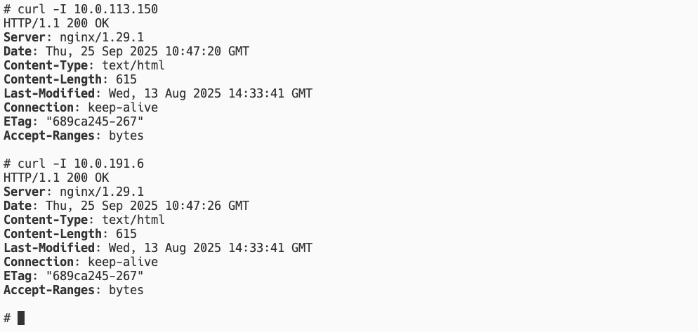 그럼 위 사진과 같이 apps 네임스페이스와 run: on-fargate이 Fargate 프로필과 매칭되어 Fargate 위에 올라간 것을 볼 수 있다. 같은 네임스페이스에 curl이 동작하는 파드를 하나 임시로 만들고 두 Nginx 파드의 IP로 접속해보자.