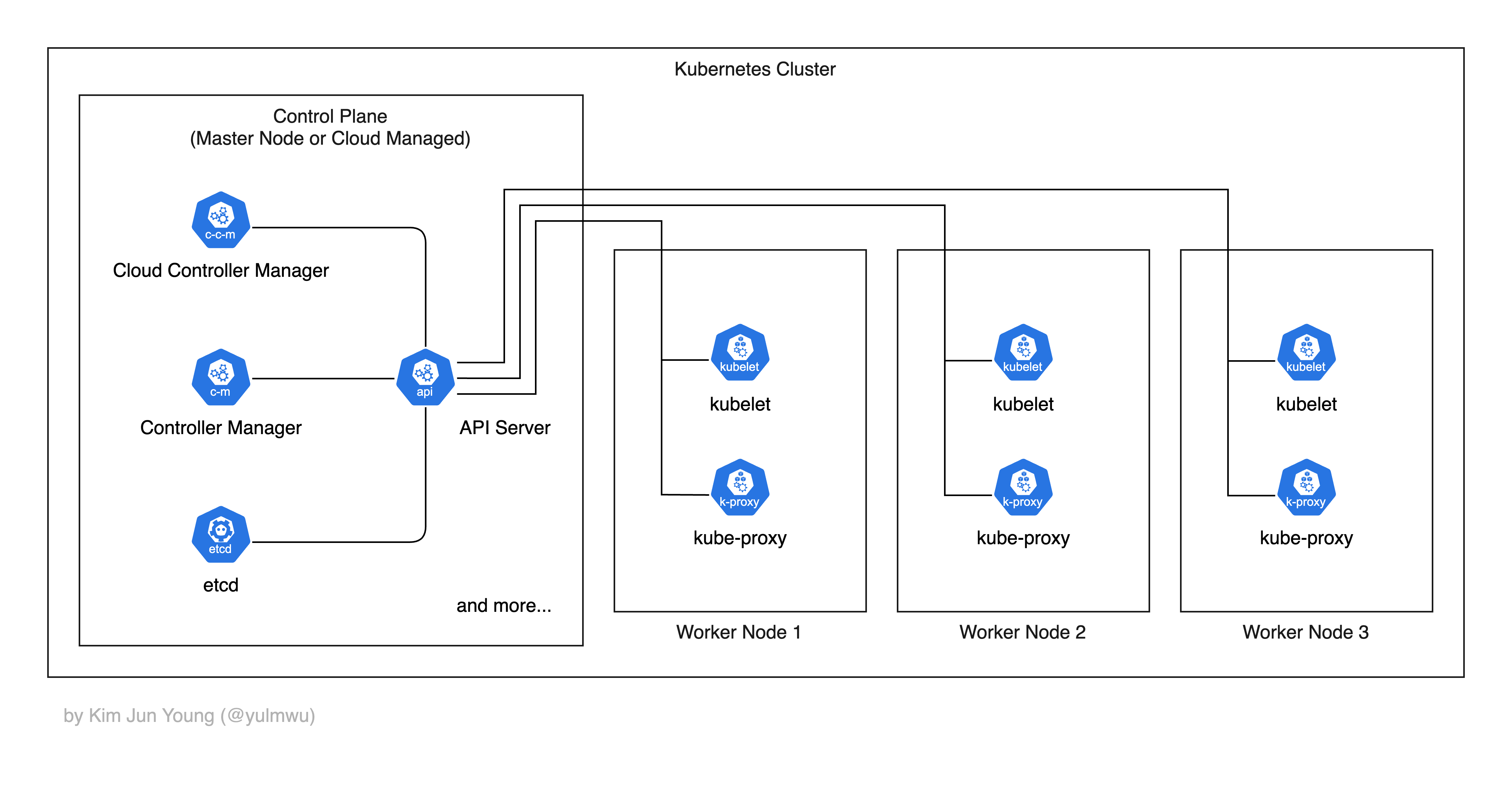전통적인 쿠버네티스 환경에선 클러스터는 하나의 컨트롤 플레인(Control Plane)와 하나 이상의 워커 노드(Worker Node)로 구성된다.