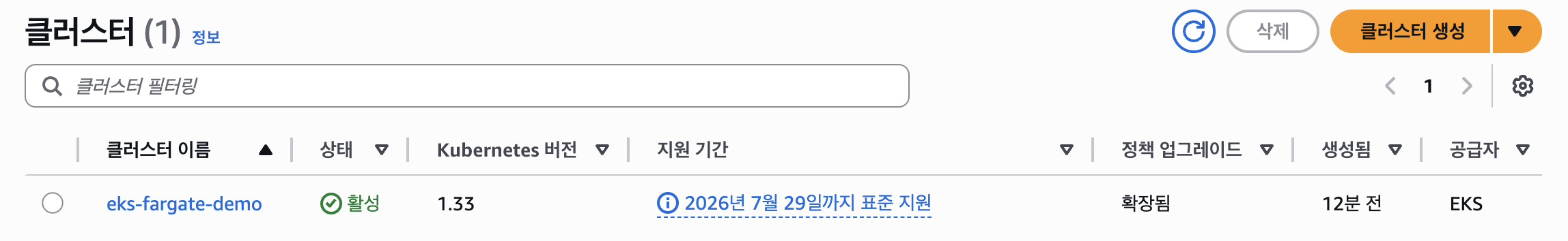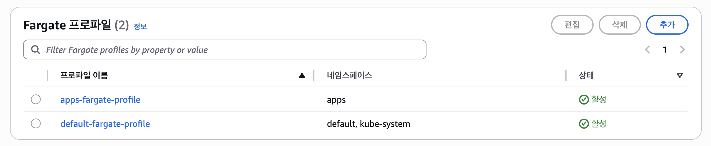 그리고 Fargate 프로필 또한 정상적으로 생성된 것을 볼 수 있다.