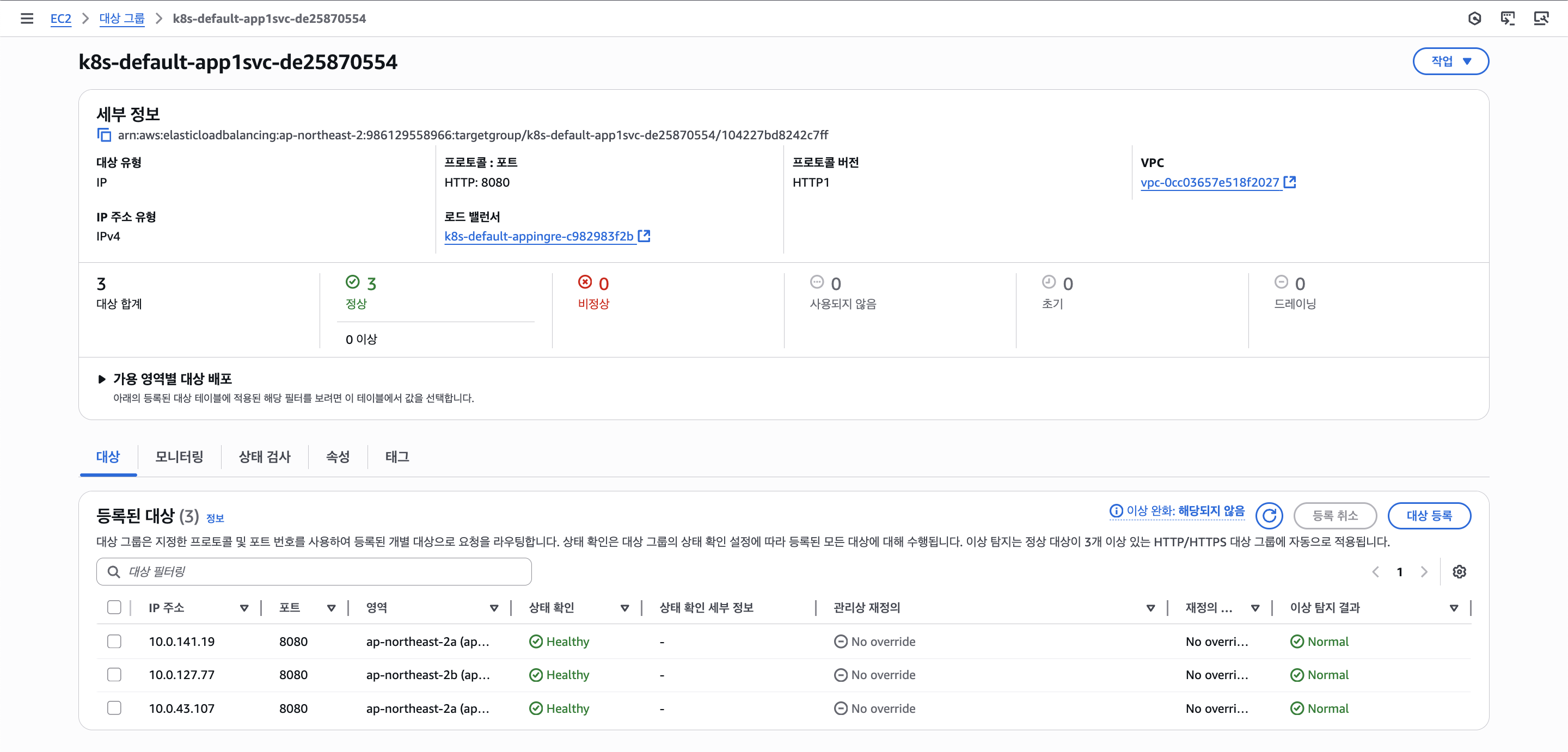 노드(인스턴스)가 아닌 파드의 프라이빗 IP가 등록된걸 볼 수 있다. (대상 그룹 타입이 IP)