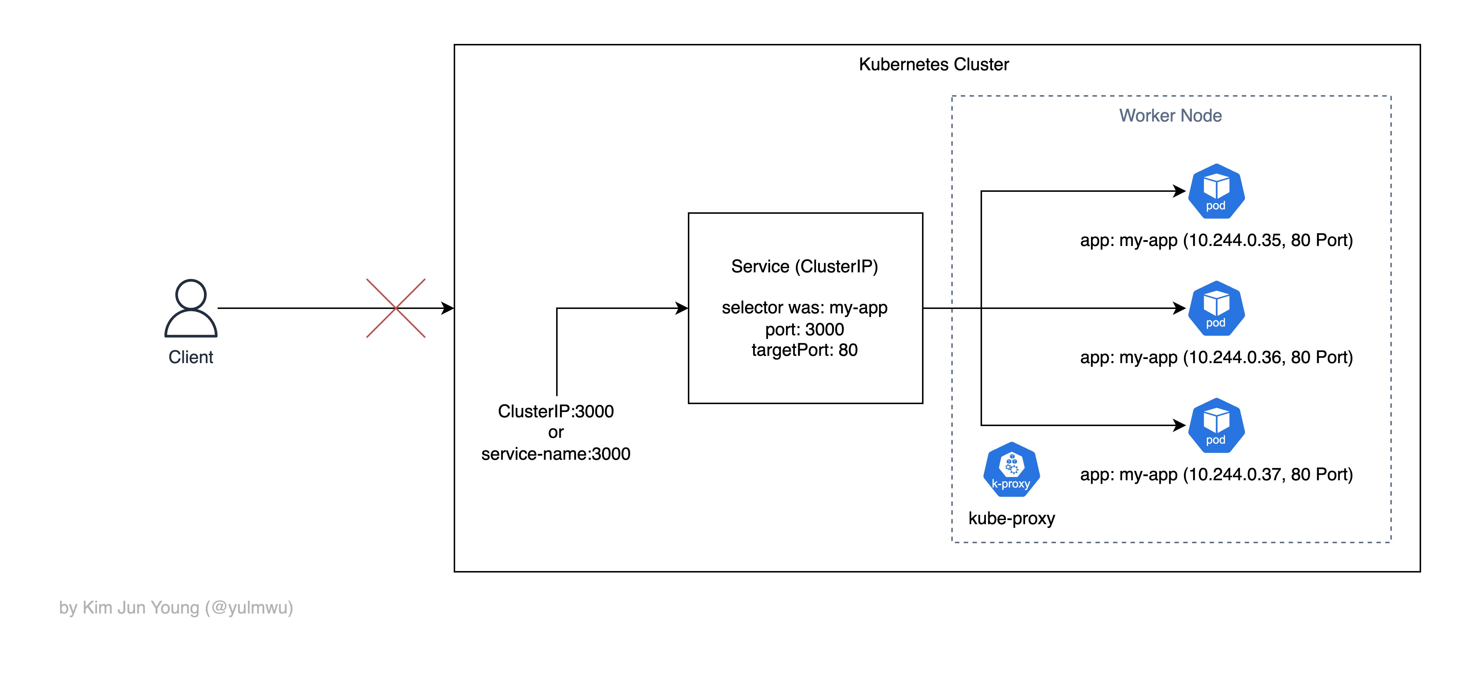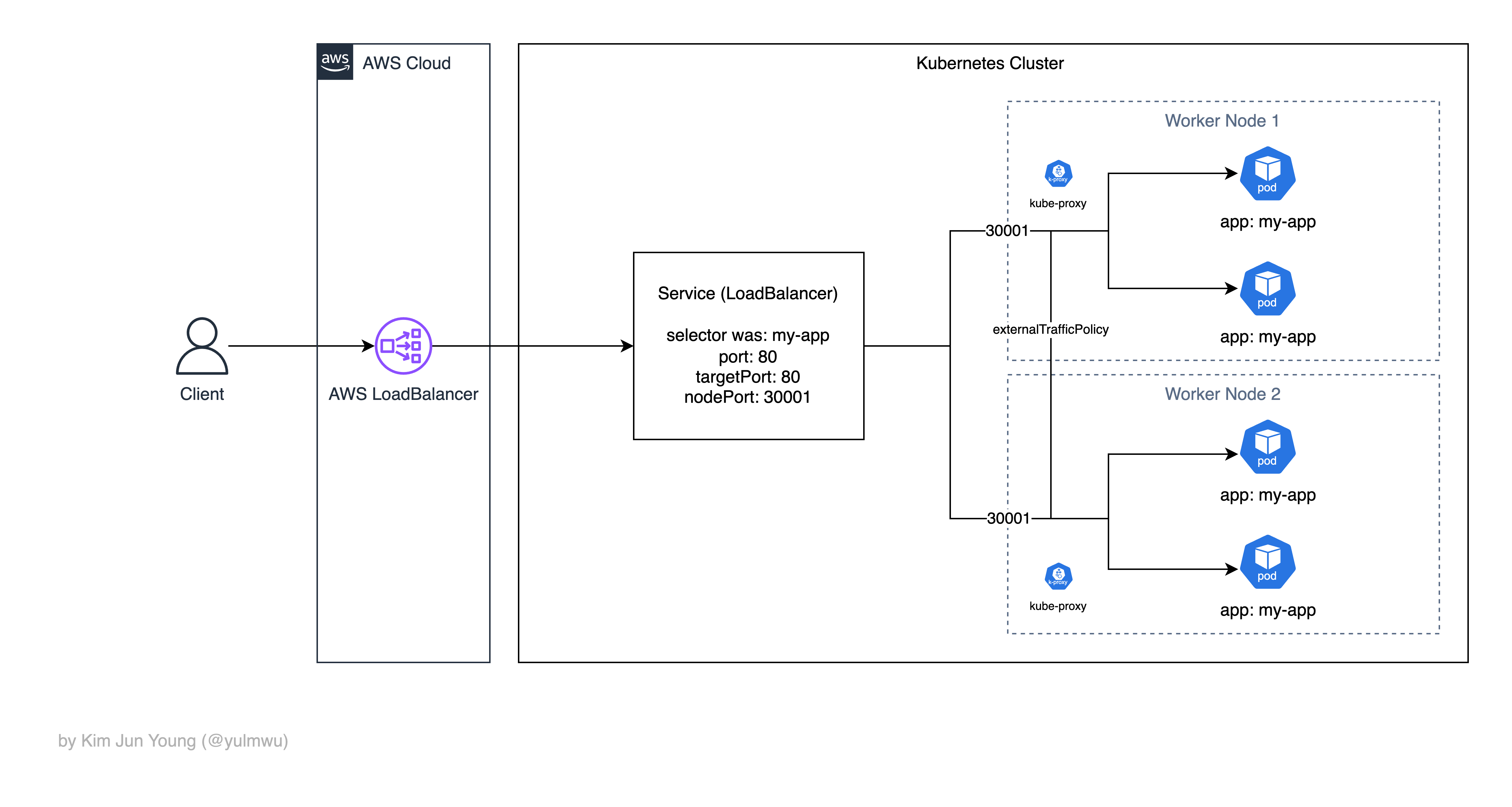 외부의 클라이언트는 Worker Node 1의 IP(또는 DNS)를 사용하여 접근을 시도하였으나 Worker Node 1의 모종의 이유로 Worker Node 2로 트래픽이 다시 보내지게 되었다.