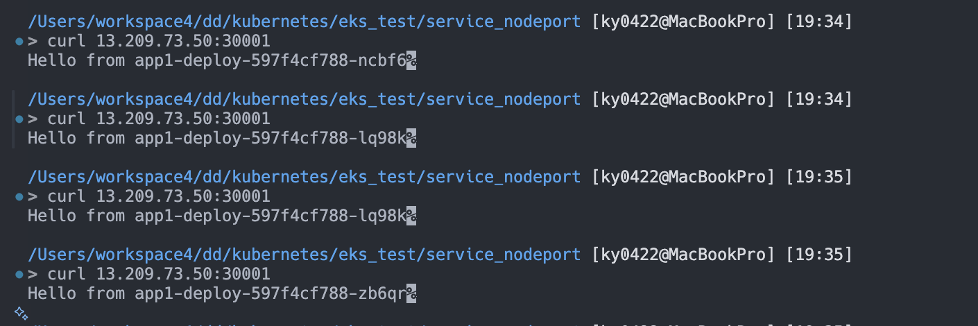 그럼 노드 IP와 랜덤한 포트(직접 지정할 수도 있긴 하다.)를 통해 노드에서 ClusterIP 거쳐 내부의 서비스(파드)에 접근할 수 있다.