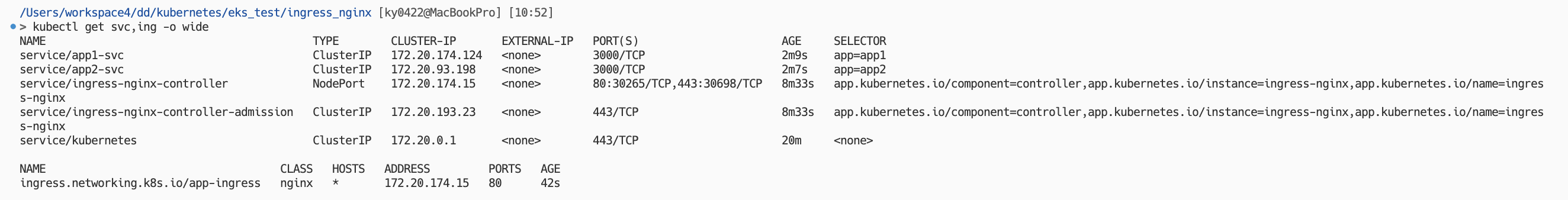 service/ingress-nginx-controller NodePort 172.20.174.15 <none> 80:30265/TCP,443:30698/TCP 8m33s app.kubernetes.io/component=controller,app.kubernetes.io/instance=ingress-nginx,app.kubernetes.io/name=ingress-nginx