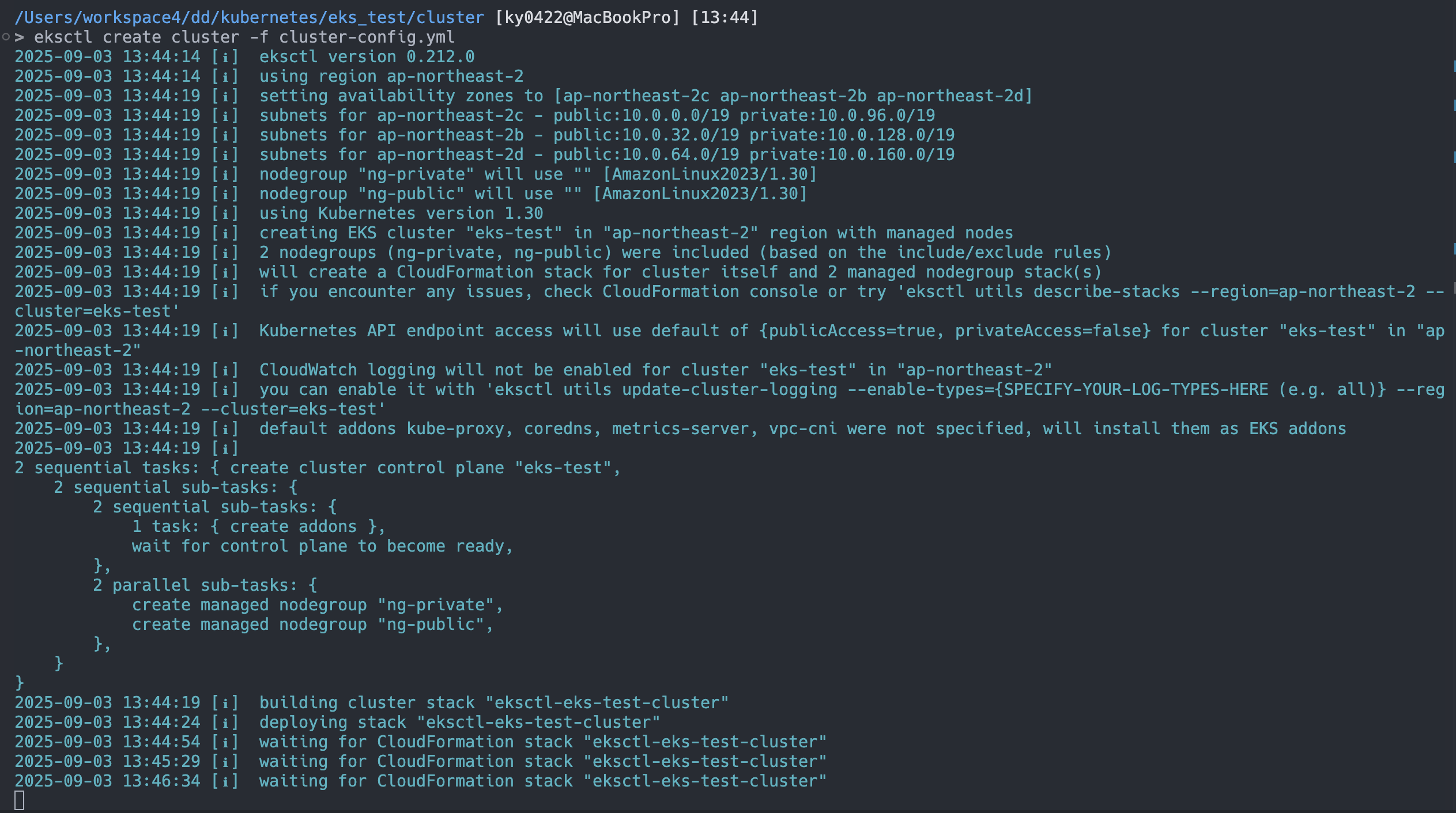 그리고 아래의 명령어를 입력하여 EKS 클러스터를 만들고 kubeconfig를 업데이트해보자. (실습 시 요금이 발생할 수 있으니 주의하자.)