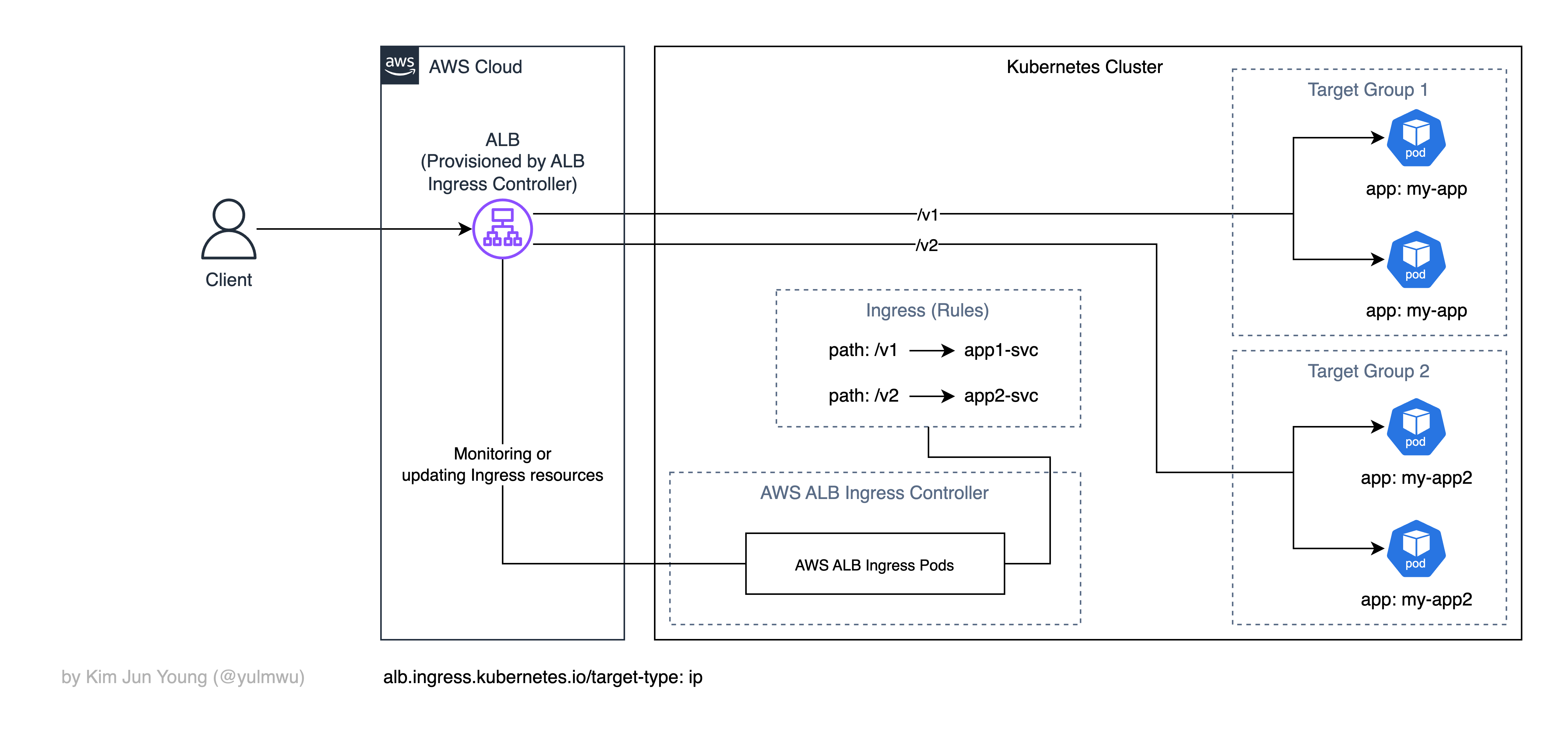 즉 Nginx Ingress Controller는 파드가 직접 리버스 프록시 역할을 하며 로드밸런싱을 하는 반면, ALB Ingress Controller는 Ingress 리소스를 모니터링하며 ALB를 업데이트하는 역할이고 AWS ALB가 로드밸런싱을 직접 한다는 것이다.