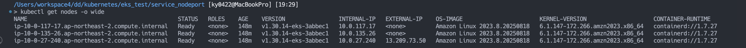 이제 실습을 해보겠다. 모두 ClusterIP 서비스를 제외하면 Minikube 등의 로컬 환경에서 테스트하기엔 어려움이 있고, 실제 Public IP와 L4, L7 로드밸런서(NLB, ALB)가 있어야 제대로 테스트해볼 수 있기 때문에 AWS EKS에서 진행해보도록 하겠다.