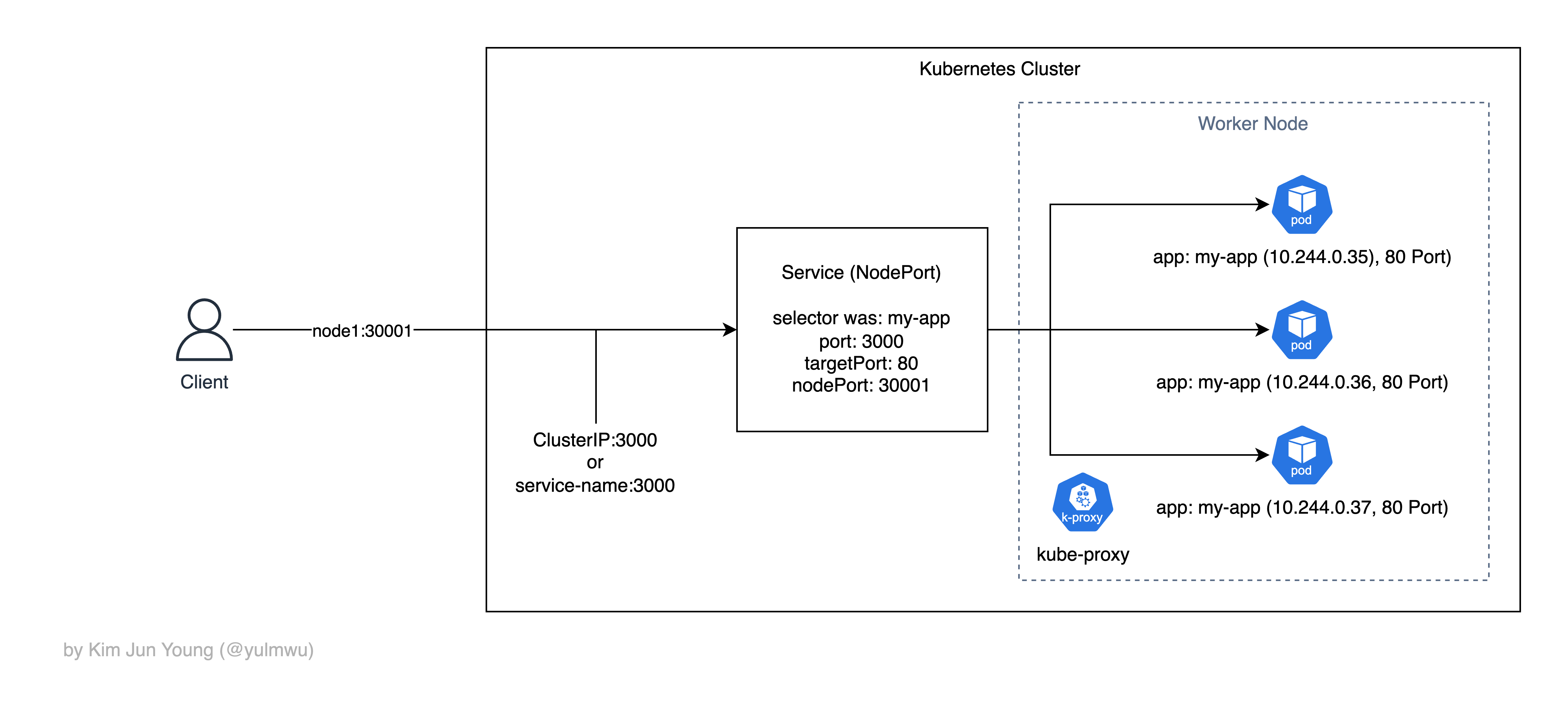 이처럼 노드들의 특정한 포트를 열어서 클러스터 내부로 접근하는 것이다. 그런데 ClusterIP 다이어그램과 비슷한 모습을 하고 있다. 이는 필자가 잘못 그린게 아닌, NodePort는 내부적으로 ClusterIP를 자동으로 생성하기 때문이다.