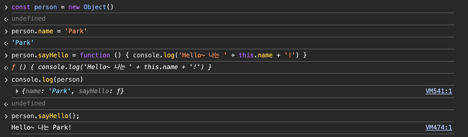 Object 생성자 함수new Object(); 과 같이 new 연산자와 함께 Object 생성자 함수를 호출하면 빈 객체가 생성되어 반환된다. 이렇게 빈 객체를 생성한 이후 프로퍼티 또는 메서드를 추가해 객체를 완성할 수 있다.