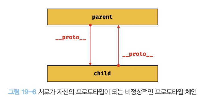 이렇게 순환 참조하는 프로토타입 체인이 만들어지면, 프로토타입의 종점이 존재하지 않아 프로퍼티를 검색할 때 무한 루프에 빠진다고 한다.