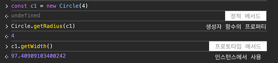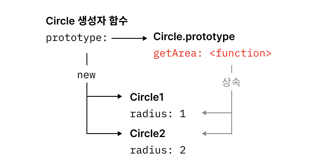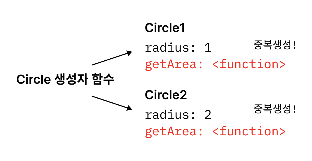 하지만 위에서 간단하게 주석으로 설명한 대로, Circle 생성자 함수를 통해 생성되는 모든 인스턴스는 같은 동작을 하는 getArea 메서드를 중복 생성하여 중복 소유하게 된다.