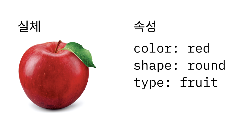이렇게 물질의 속성값 color, shape, type 을 구체적으로 표현하면 특정한 사물인 "사과" 를 다른 사물과 구분하여 인식할 수 있게 된다.