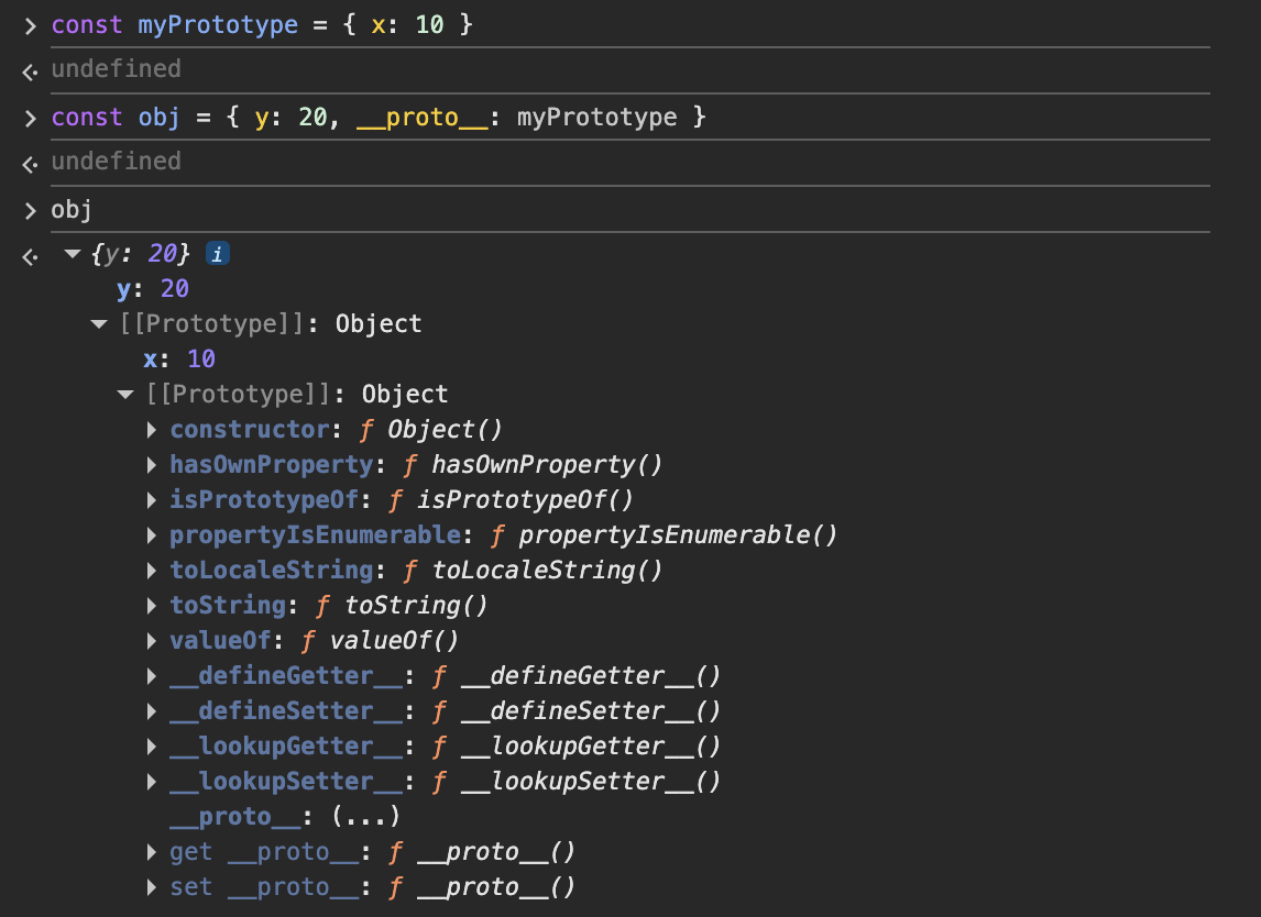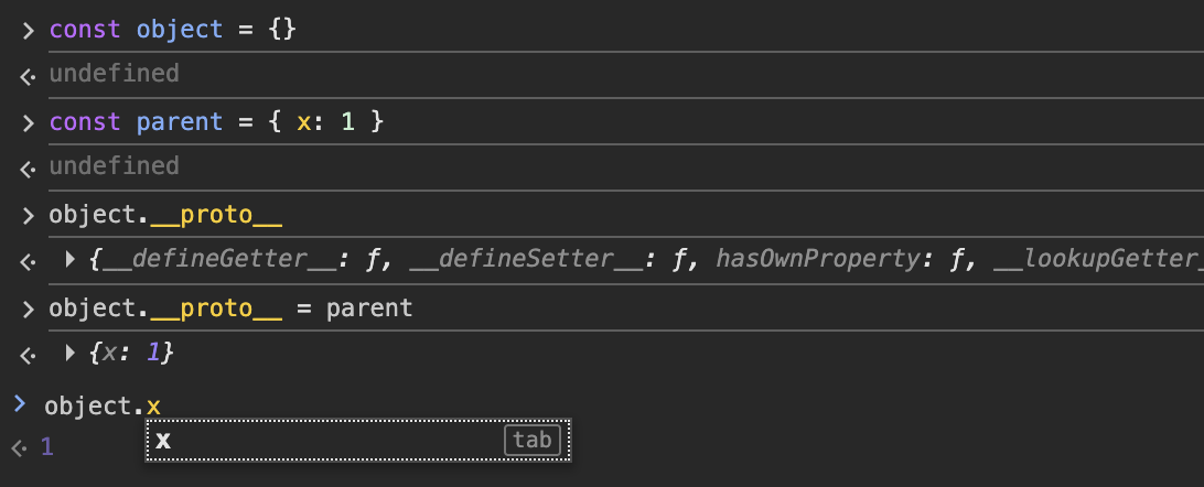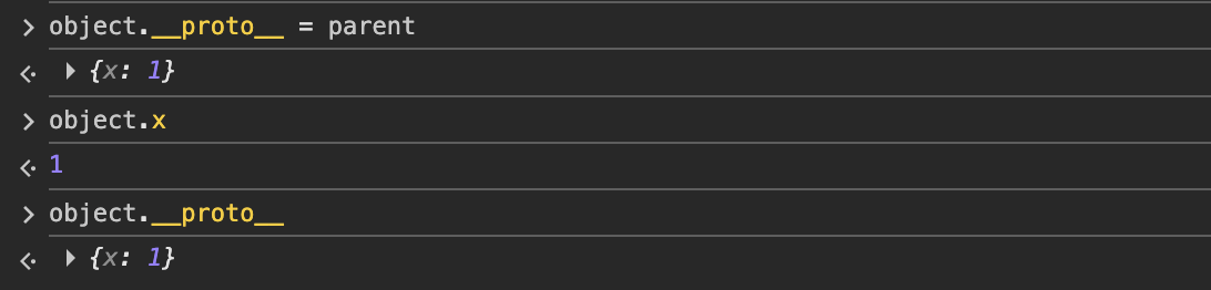 __proto__ 를 통해서 object 의 프로토타입을 취득했고, object.__proto__ = parent 를 통해 object 객체의 프로토타입을 교체(새로 할당)했다. object 객체는 x 라는 프로퍼티를 속성받게 되었다.