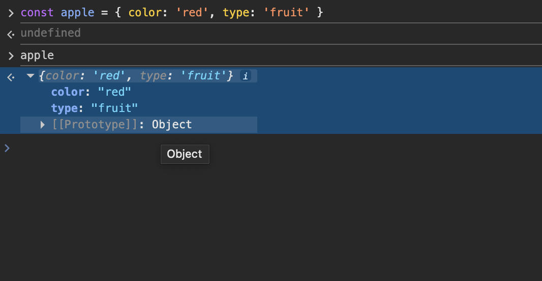 [[Prototype]] 내부 슬롯에는 apple 객체의 프로토타입인 Object.prototype 이 들어있는 것을 확인할 수 있다.