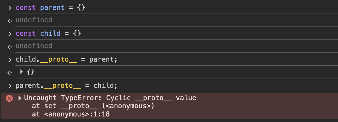 위에서는 에러가 발생했지만, 만약 이런 코드가 에러 없이 정상적으로 처리되면 서로가 자신의 프로토타입이 되는.. 비정상적인 프로토타입 체인이 만들어진다.