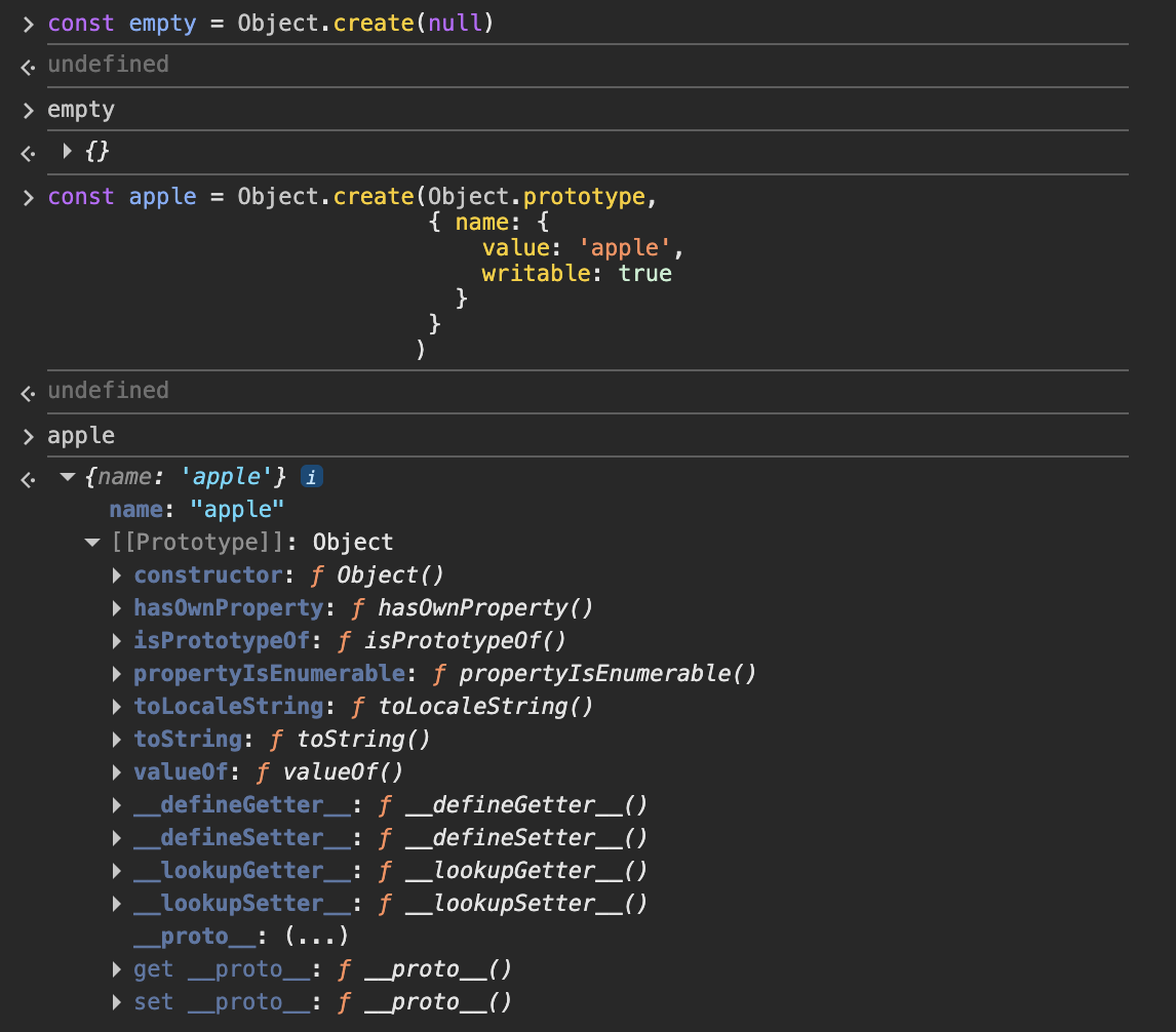 첫 번째 매개변수에 Object.prototype 을 전달해 apple 객체가 그를 상속받을 수 있도록 했고, 두 번째 매개변수를 통해 apple 객체의 프로퍼티를 정의했다.