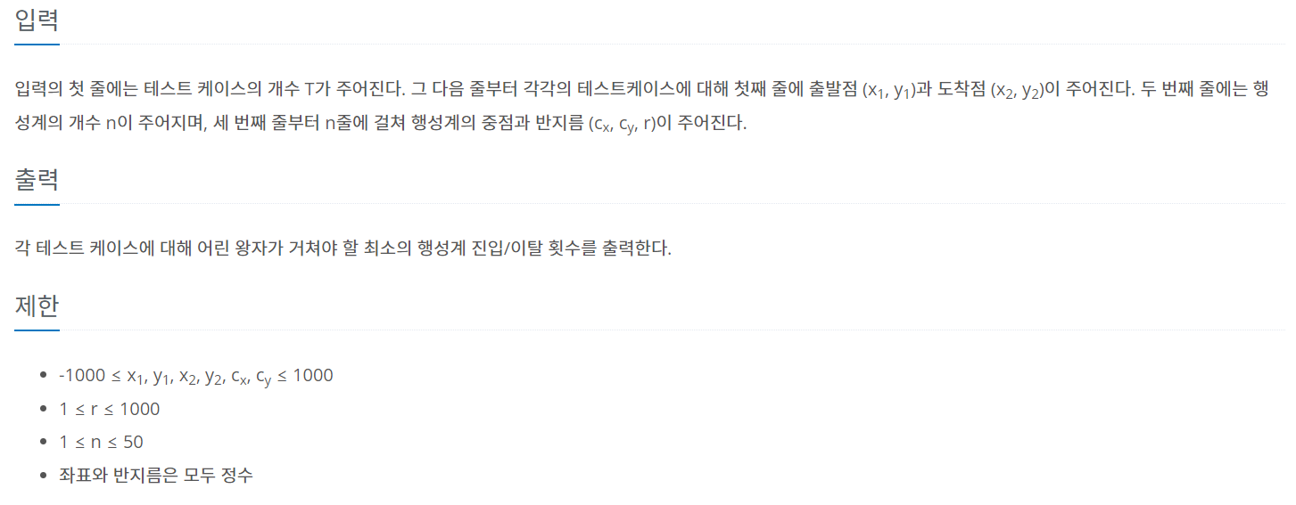 점과 점 사이의 거리를 비교하여 원을 지나는 경우에만 count를 증가시켜 해결하였다.