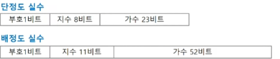 가수부(mantissa) : 실수의 유효 자릿수들을 부호화된 고정 소수점으로 표현한 것