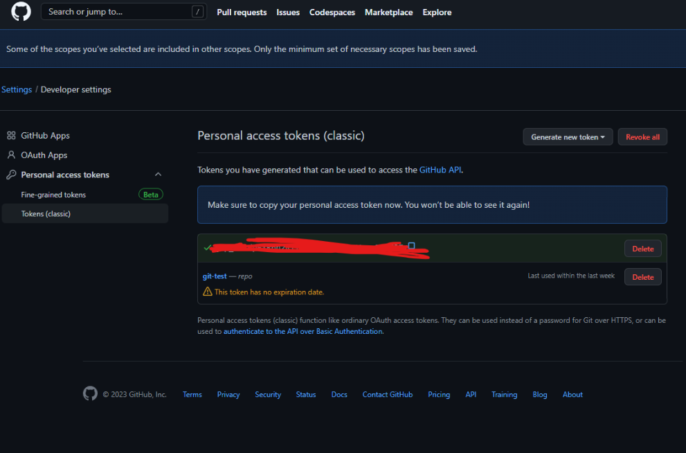 우측 상단 프로필 - Settings - Developer Settings - Personal access tokens - Generate new token