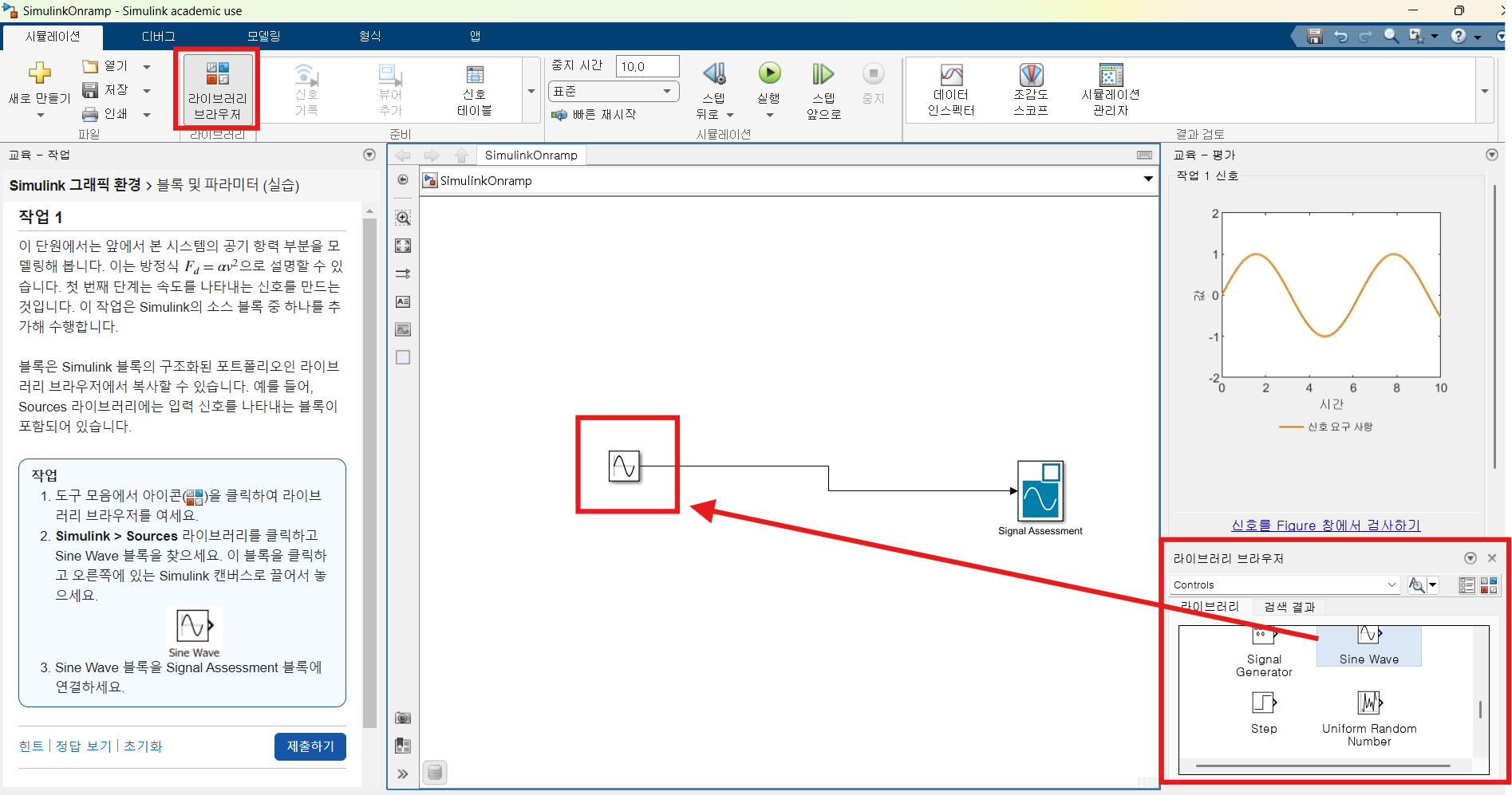 Sine Wave가 블록의 이름이고, 아래에 회색 글씨인 Simulink/Sources가 해당 블록이 소속된 라이브러리이다.