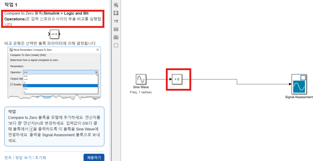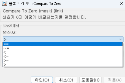 0 과의 대수 비교 (>,<,>=,>=,==,~=..등 여러 연산을 Parameter로 설정 가능) 후 결과 출력하는 블록