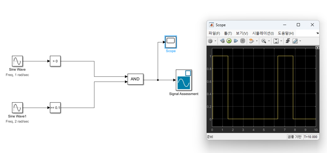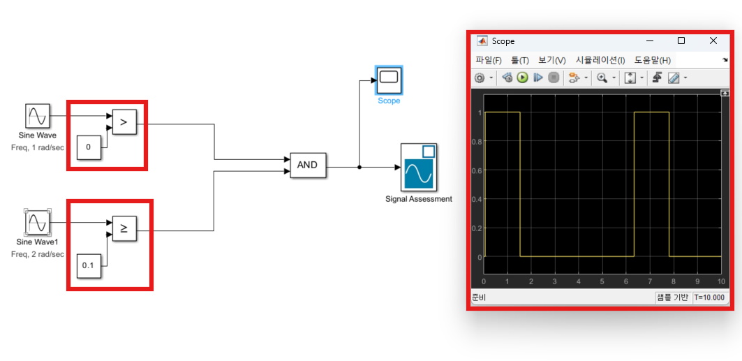 기존 블록들을 Relational Operator 로 대체해도 동일한 결과가 나옴을 Scope를 통해 확인할 수 있다.