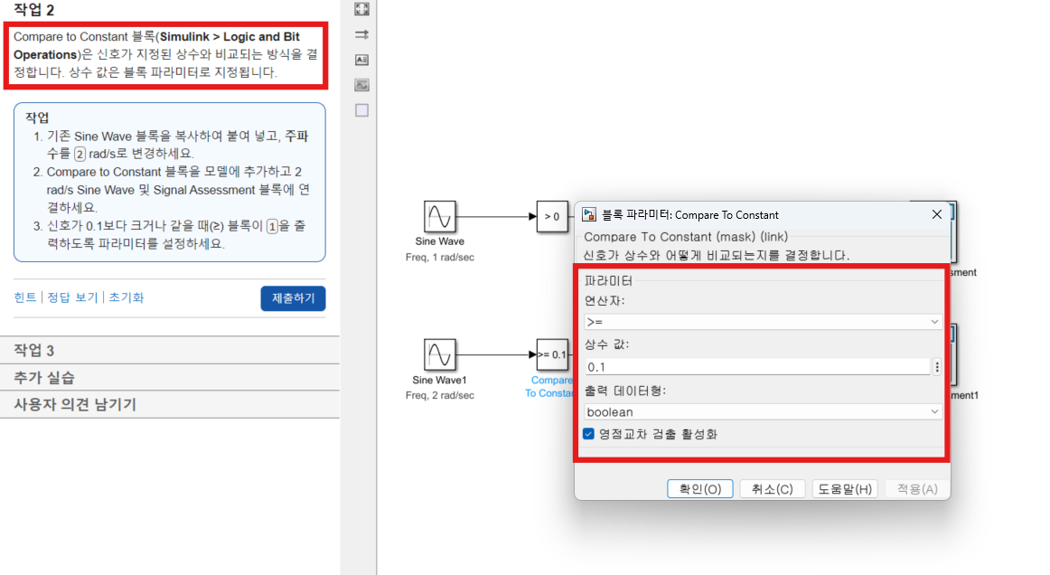 Compare to Zero Block 과 마찬가지로 상수와의 비교에 있어 비교에 있어 >,<,>=,>=,==,~=..등 여러 연산을 Parameter로