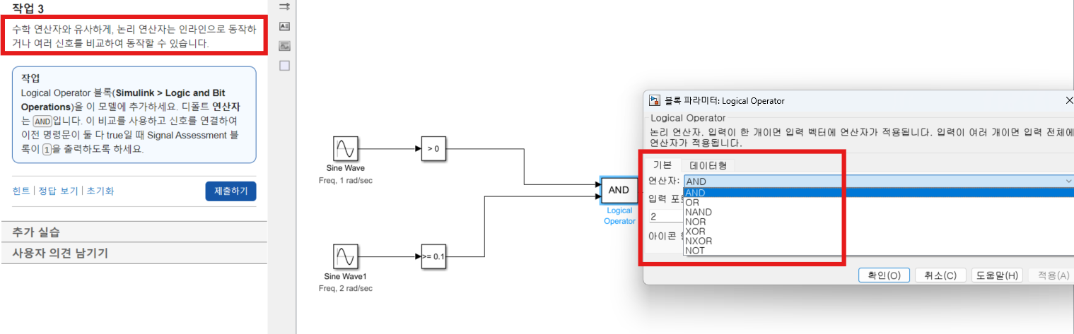논리연산을 수행하는 블록으로 파라미터로 다양한 논리 연산자를 설정할 수 있다.