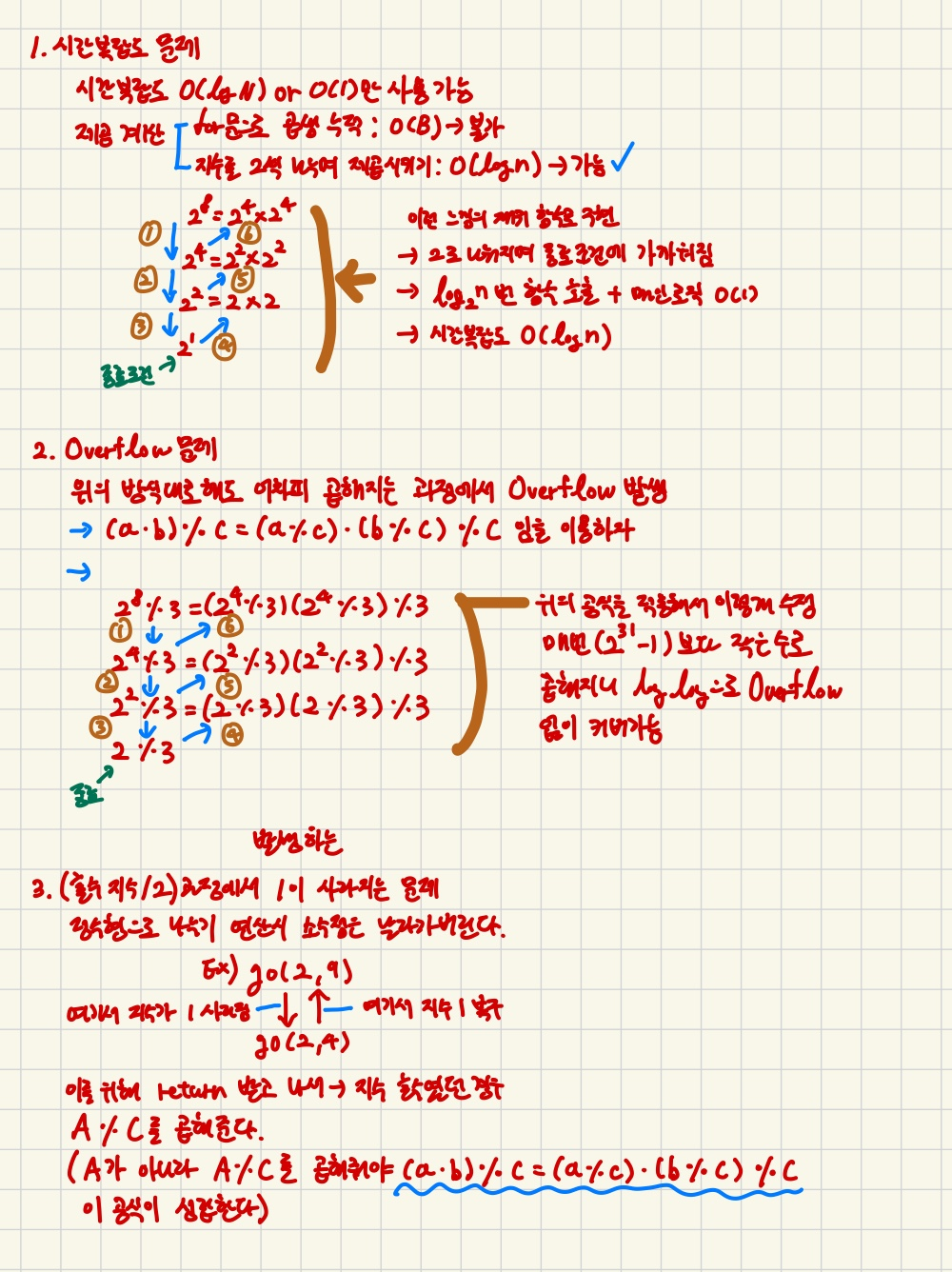 이 문제는 단순해보이지만 정수론에 관련된 문제로 -> 시간 복잡도, overflow, 홀수 지수에 대한 처리까지 총 3가지 난관이 존재한다.