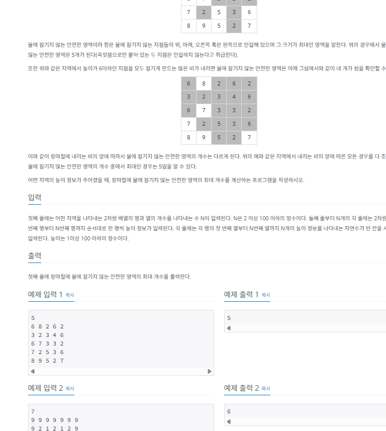 DFS or BFS를 이용해서 연결 컴포넌트를 찾는 문제이다(나는 DFS로 풀 것이다). 그러나 기존에는 0,1로만 이루어진 맵을 DFS 로 탐색했다면, 이번에는 1~100 사이의 수로 이루어진 맵을 탐색해야한다.