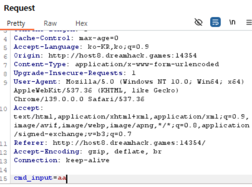if cmd != '' or key == KEY: 의 원래 의도는 AND였을 텐데, OR을 사용하여 전부 우회할 수 있게 되었습니다. 논리 조건 하나의 잘못된 사용이 시스템 전체를 위태롭게 할 수 있음을 깨달았습니다.if cmd != '' or key == KEY allowed bypassing key verification if any command was provided.cmd_input, which could be manipulated using Burp Suite.ls revealed files, including flag.txt.sleep 6 triggered the 5-second timeout, which leaked the admin KEY.