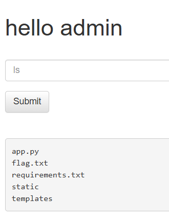 return redirect('/')if cmd != '' or key == KEY: 코드 때문에 cmd가 비어있지 않기만 하면(= 아무 문자열만 넣어도) 키 검증을 건너 뛰고 명령 실행 루틴으로 들어가는걸 확인할 수 있습니다.cmd_input도 받습니다.key를 cmd_input 으로 바꾸어 key 입력창을 cmd 입력창으로 바꾸었습니다.