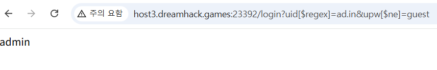 /login?uid[$regex]=ad.in&upw[$ne]=guest 을 입력해줍니다. uid[$regex]=ad.in : $regex는 정규표현식의 약자로, 특정 패턴을 가진 값을 찾고싶을 때 사용하는 연산자입니다. .은 아무글자나 들어올 수 있습니다. 따라서 uid[$regex]=ad.in은 아이디가 ad( )in인 사용자를 찾기 위한 쿼리입니다. [$ne] : 같지 않음의 약자입니다. 따라서 위에선 비밀번호가 guest가 아닌 사용자를 찾고싶을 때 사용하는 연산자입니다.ad.in이고, 비밀번호가 guest가 아닌 사용자를 찾는 과정입니다.