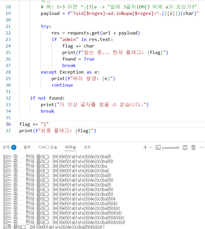 import requests: 파이썬으로 웹사이트에 접속하게 해주는 도구를 가져옴.import string : 글자 목록을 가져옴. string.ascii_letters는 알파벳 대소문자 전체, string.digits는 숫자 0부터 9까지를 의미. 플래그에 쓰이는 문자들을 미리 chars 이라는 변수에 담아둠.flag = "DH{" : flag의 시작부분을 변수에 담아둠.for char in chars 는 char안에 들어갈 글자가 chars 안의 무슨 글자인지 하나씩 넣어보는 과정.payload = f"?uid[$regex]=ad.in&upw[$regex]=^.{{{i}}}{char}" uid[$regex]=ad.in를 씀.^ : 문자열의 처음부터 확인하라는 뜻.{{{i}}} : 앞에 있는 {i}개의 글자는 뭐가 오든 뛰어넘으라는 뜻 (중괄호를 3개 쓴 이유 : 파이썬의 f-string에서 {}는 변수를 넣는 칸인데, 변수가 아니라 중괄호 글자임을 알려주려면 두번 작성해야 함. 중괄호 안에 변수 {i}를 넣어야 하는 상황이기에 중괄호를 3번 작성함.){char} : {i}개의 글자 그 다음 글자가 char과 똑같은지 확인.try: 에서 한글자씩 대입해서 플래그를 찾아낸다.