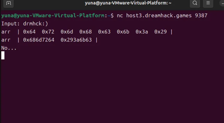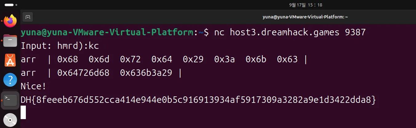 int_arr[0] 과 int_arr[1]이 각각 0x64726d68, 0x636b3a29 이면 플래그를 얻을 수 있는걸 알아냈습니다.
