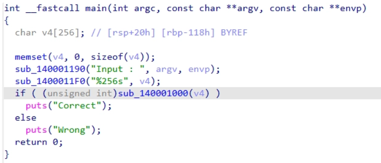 코드를 확인해보니 sub_140001000 이라면 correct가 나오는 것을 확인할 수 있다.