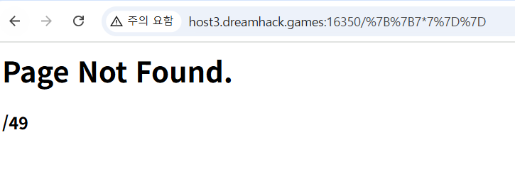 SSTI 공격이 가능한지 확인해보기 위해, URL 칸에 /{{7*7}} 을 입력해 보았습니다. 그랬더니 %s 에 7*7 계산 결과인 49가 나타나고 있음을 확인할 수 있습니다.