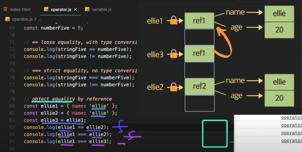obj1 == obj3; // true (복사된 값이므로 동일한 레퍼런스 가짐)
