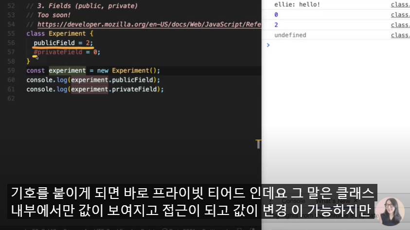 field 이름 앞에 #를 붙이면 private field가 된다. 클래스 외부에서는 이 값을 읽거나 변경할 수 없게 된다.